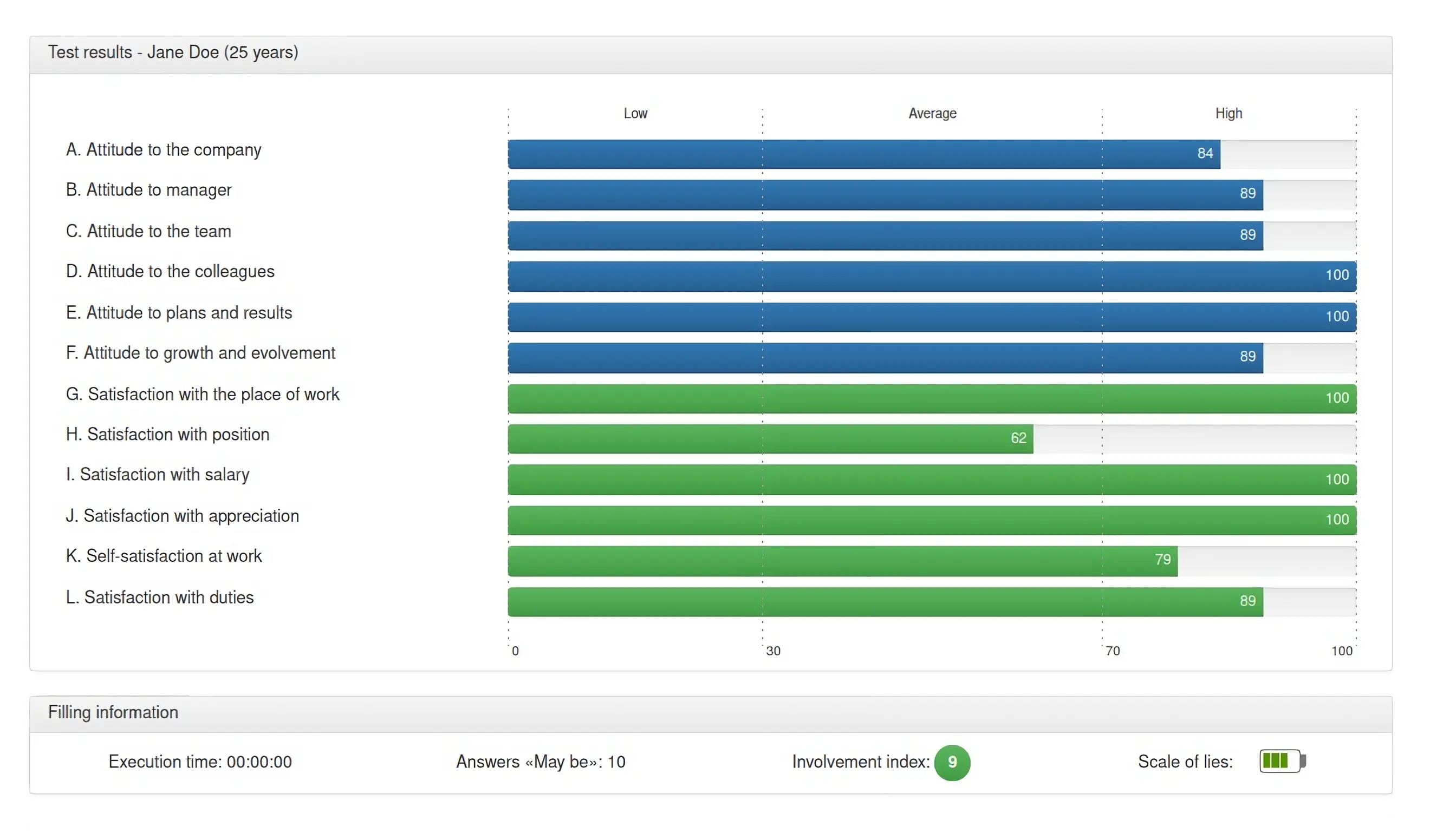 Reports for each employee, for departments and for the entire company will be immediately available in your personal account. You will receive a graph of employee engagement in the context of twelve different areas of company life.