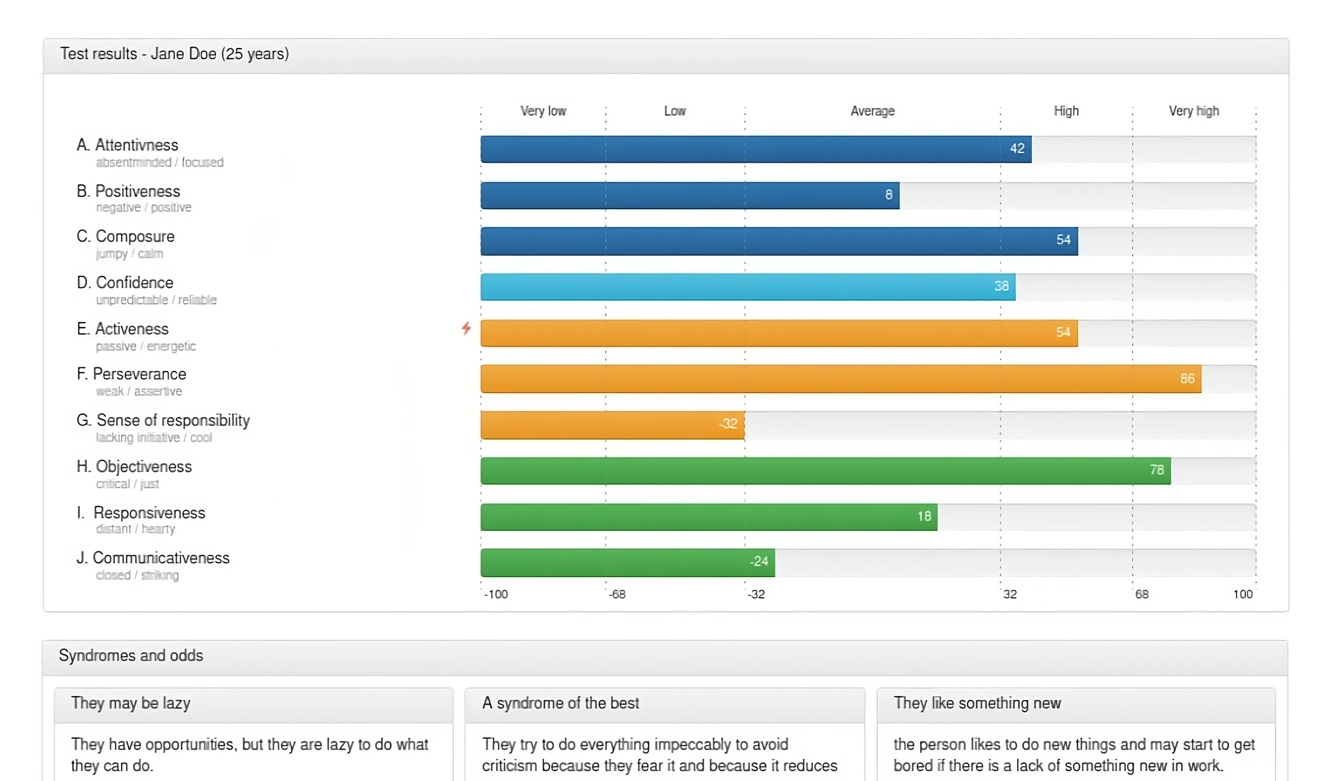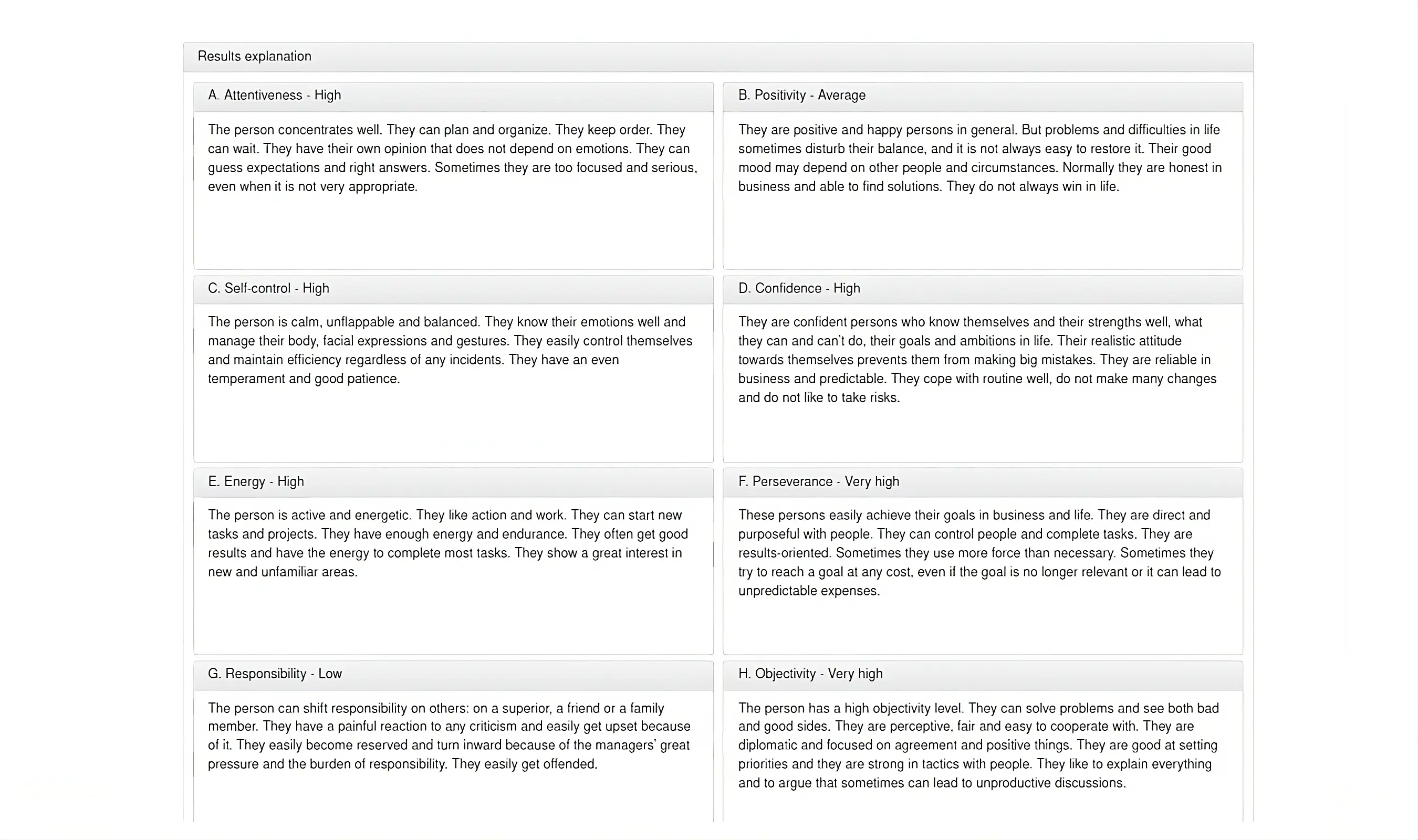There are no right or wrong answers in the Tools test - the results only show strengths and weaknesses. For example, a candidate for an aeronautical design engineer position may not need to be empathetic or outgoing, but a high level of attentiveness would be an obvious necessity. A good support specialist, on the contrary, should be sociable and able to understand the feelings of other people, but at the same time he does not have to have increased focus.
