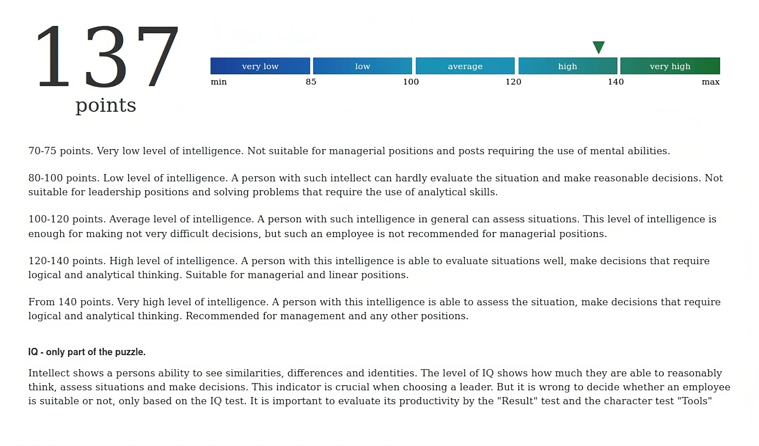 As a result of testing, we will receive the candidate’s numerical IQ and a transcript with a description and recommendation as to whether a job that requires quick and error-free decision-making that is important for the company is suitable for them or not.