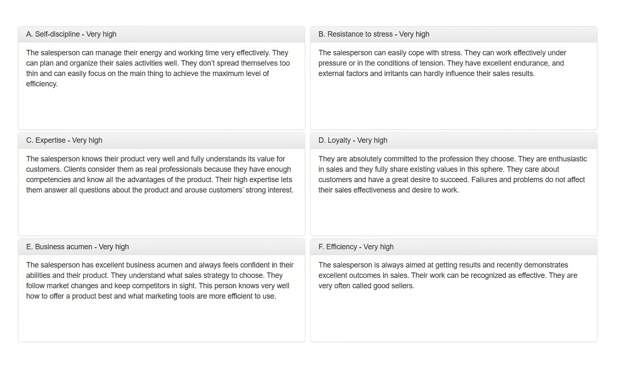 The "Sales" test evaluates the professional qualities of sales managers according to 12 parameters: