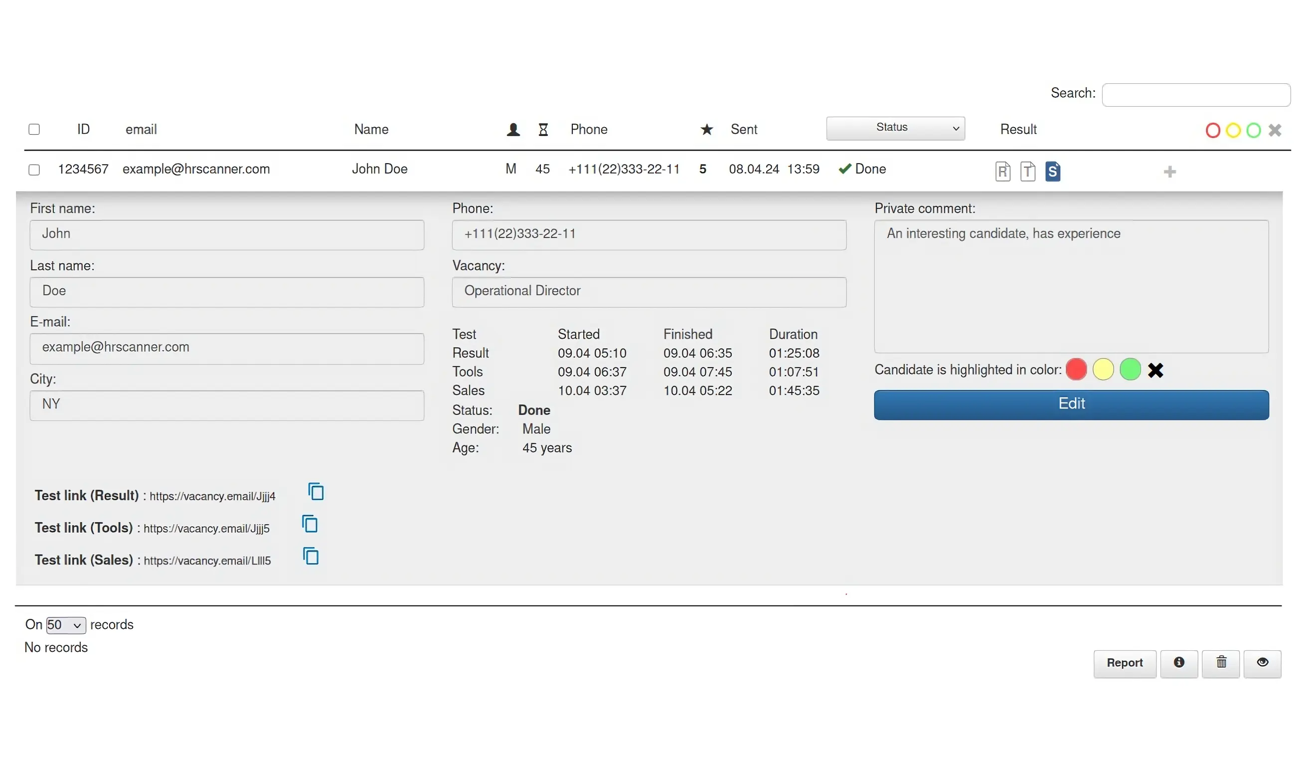 The system interface is intuitive and convenient: in one click you can send the candidate the required test, view the results, send a polite refusal, or transfer the applicant to the next stage of selection.